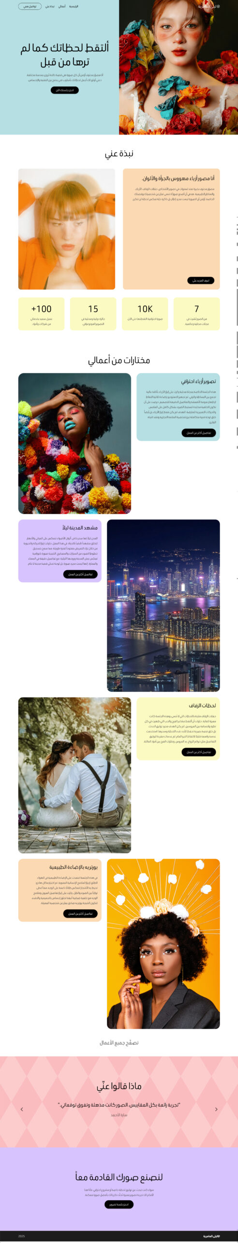 قالب مصور فني بواجهة أنيقة وسهلة الاستخدام، يوفّر منصة مميزة لعرض البورتفوليو واللحظات البصرية — مثالي للمصورين المحترفين والاستوديوهات الإبداعية.